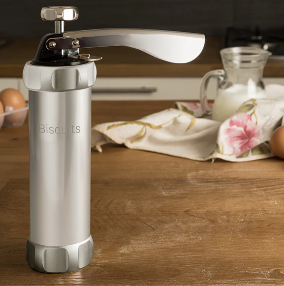 Biscuits es la pistola para galletas que, en pocos minutos, permite llenar una bandeja de horno con 20 formas y 2 medidas diferentes.