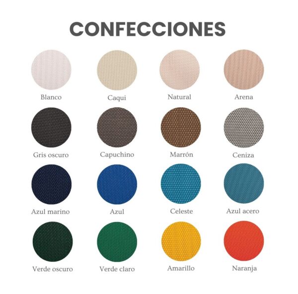 Amarilla, Verde claro, Blanco, Arena, Azul, Marrón, Verde oscuro, Natural, Capuchino, Azul marino, Naranja, Gris oscuro, Caqui, Ceniza, Azul acero, Celeste
