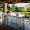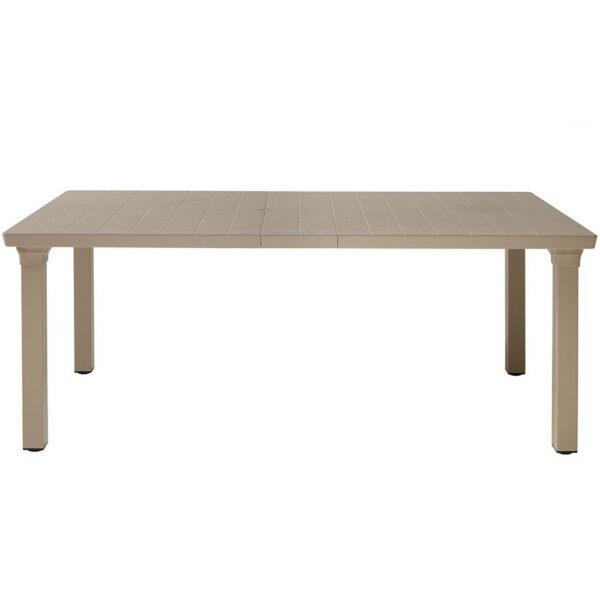 Mesa extensible de 170 a 220 cm con dos extensiones, encimera en tecnopolímero con diseño de listones y patas en aluminio pintado.